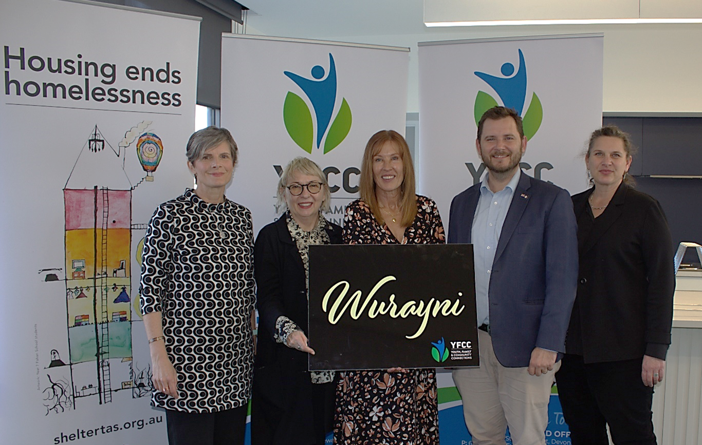To celebrate Homelessness Week this year YFCC held an event at the new Youth2Independence (Y2I) facility in Mooreville Road, Burnie. Former Housing Minister, Felix Ellis MP, YFCC President, Sarah Steel, and YFCC CEO, Ros Atkinson, revealed the official name of the centre as ‘Wurayni”